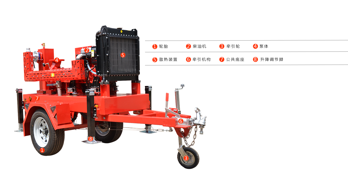 1.單級式移動泵車主要由真空輔助裝置、柴油機(jī)動力包、柴油機(jī)專用油箱、泵傳動系統(tǒng)、設(shè)備底座、自吸泵總成、防雨設(shè)施、起動裝置、起動電源裝置、進(jìn)水管總成、出水管總成、二輪移動拖車系統(tǒng)、快速起吊裝置等組成。